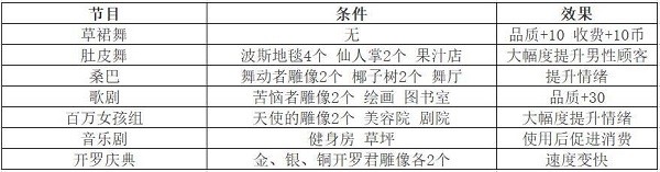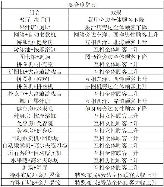 同时设施、店铺的搭配也要注意,有契合度加成,不同搭配有不同的效果,可以提升店铺的魅力。例如:美容房跟健身房的搭配,会相互增加女性顾客的关顾率;自动贩卖机和客舱建在一起会相互增加全体顾客关顾等。众多的建筑契合度搭配,就等待着大家慢慢去发掘。