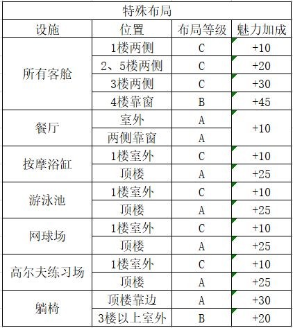 关于贴墙,建个6个左右开局就可以了,不过注意要建一个客舱,前后最好加棵植物,会有更好的加成效果,后期会有游轮扩展情节,不怕浪费土地资源。小编亲测开局只有客舱和餐厅贴墙有效果,其他都没有。