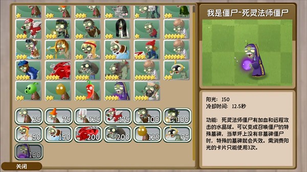 功能:死灵法师僵尸有加血和远程攻击的水晶球,可以变成召唤僵尸的特殊墓碑。当草坪上没有非墓碑僵尸时,特殊的墓碑就会失效,需消费阳光的卡片只能使用3次。