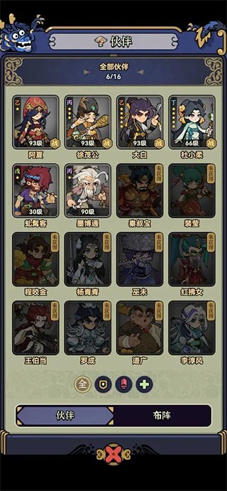 4、点击界面左侧的四宫格图标可进入伙伴系统,在这里能够培养并提升同伴的整体实力。