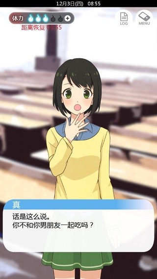 然后来到课室,第一章的女主美都里和男主寒暄了一番,不过这些对话我们可以先忽略。我们先记住里面的一个关键信息: 中午12点约饭。