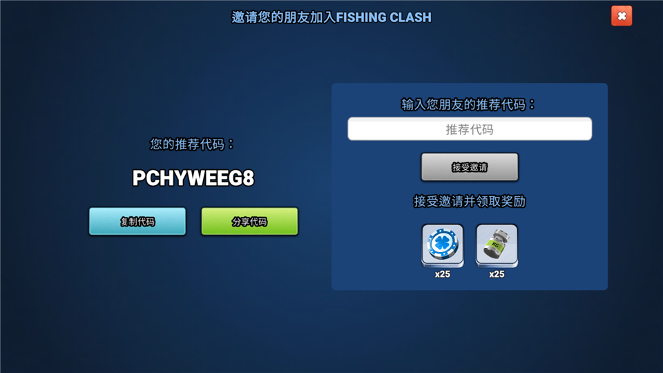 2、输入好友分享的推荐代码即可获得奖励,当然玩家也可以分享你的推荐代码给其它玩家。