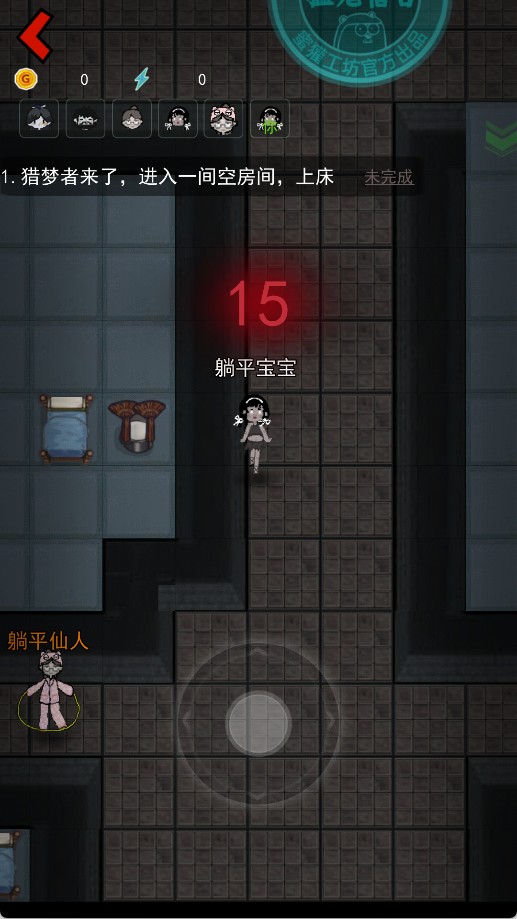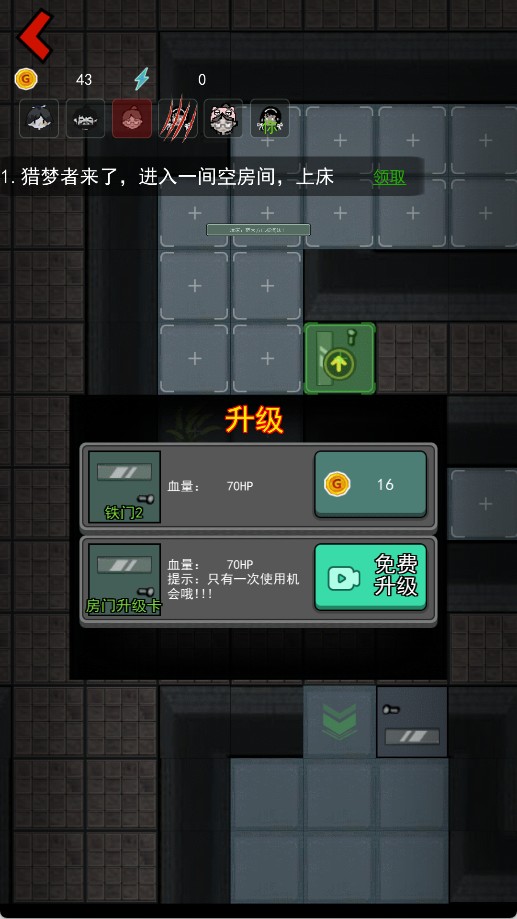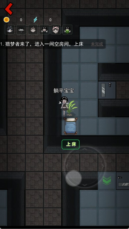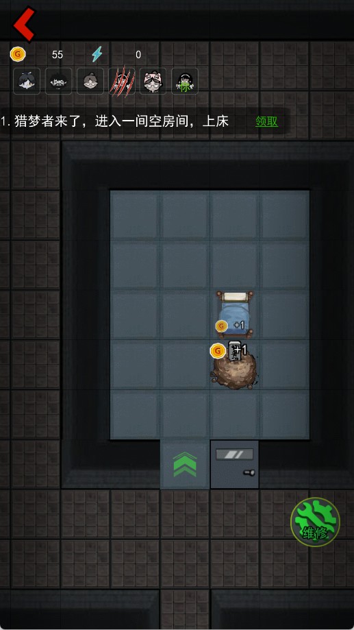 3、进入房间后直接上床,通过睡觉涨金币,建造装备,无论发生什么事千万不能下床,如果有怪人破门而入,也不要下床。