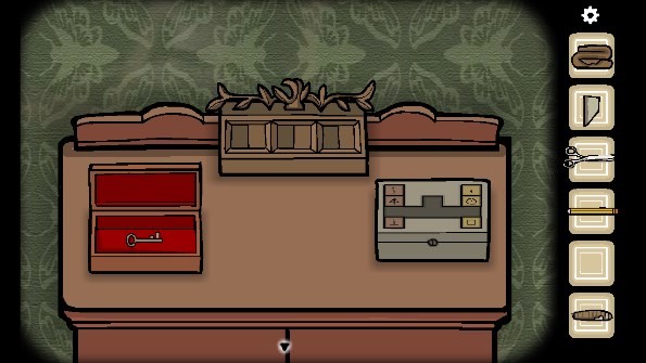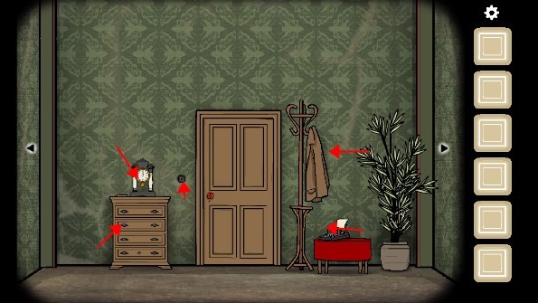 3、打开左边的盒子获得「钥匙」,移动旁边盒子上的方块到正确的位置,打开盒子后获得「照片碎片」,点击镜子穿上大衣,出现女人后来到门口