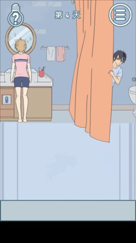先点击场景二里的刷牙杯得到螺丝刀,点击场景二的柜子出现开关,将螺丝刀放到开关上出现调节冷热水的装置先点击水龙头放满水,然后点击开关使水沸腾镜子出现水蒸气,关闭开关,回到场景一点击闹钟叫醒女朋友,即可通关。