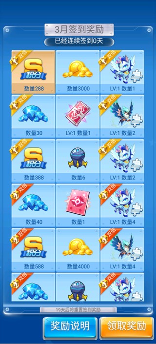每日签到可获得S积分、金币、钻石、宠物碎片等丰富资源。部分奖励带有双倍标识,让签到变得更加诱人,奖励更多。