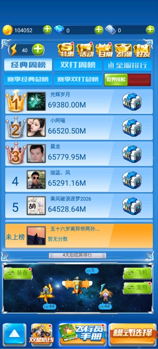 显示经典模式中的世界排名与玩家分数,助你一探全球玩家的成绩。提供装备、飞机、宠物等养成系统入口,帮助你提升战斗力。同时,还有双星航线、飞行员手册等功能,为你的飞行之旅增添更多玩法。