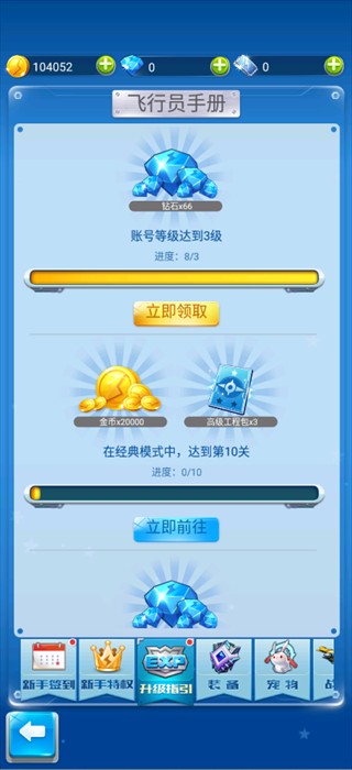 展示账号升级、关卡挑战等任务,完成任务后可领取钻石、金币、高级工程包等奖励。通过飞行员手册的引导,你可以更有方向地提升自己的能力和资源。