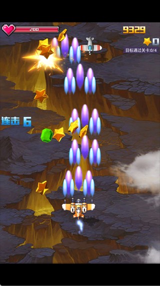 操控战机躲避敌机弹幕,收集星星和道具,通过连击加分,提升得分并推动关卡目标。连击是高分的关键,保持流畅的操作和灵活的躲避,可以帮助你在敌人密集弹幕中脱颖而出。