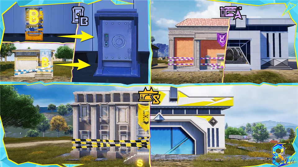 ●S级宝库:经典Erangel主题;与沙盘互动可预测下一个安全区位置,并使区域内天气变为雨天。宝库内的展品均可互动以触发特殊效果,获得额外奖励。此外还设有军火室,提供高级军事物资。