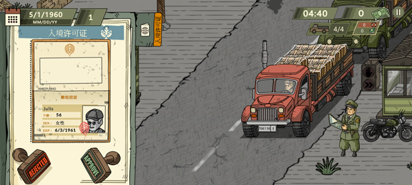 4、进入游戏如图,玩家需司机给出的证件来判断是否真实,并给予是否放行;