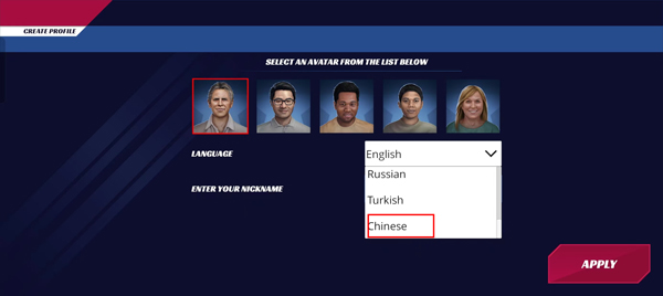 2、在角色选择页面下方有一个选择,点击选择“chinese”,选择好了之后就会变成中文了。