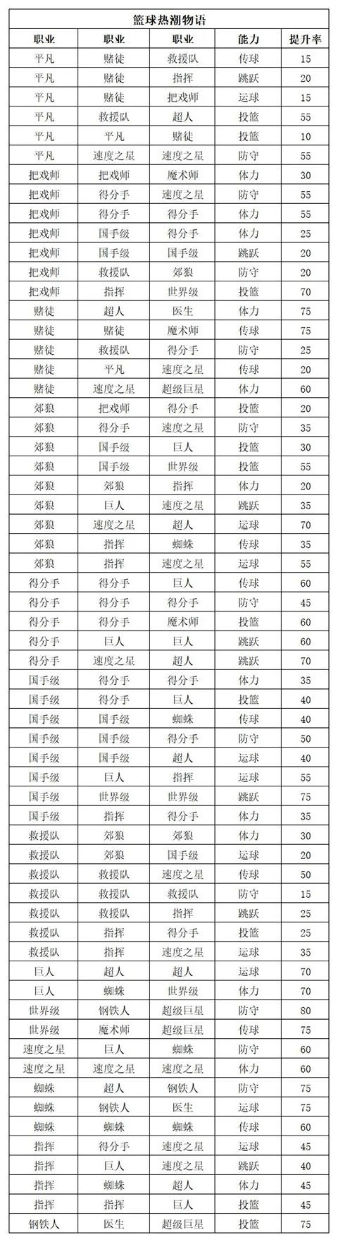 2、球员类型,分为1到5星,5星有3个——超级巨星,钢铁侠和医生,4星有4个——超人,世界级,魔术师和蜘蛛人,3星4个——指挥,得分手,速度之星和壮汉;2星三个——救援队,郊狼,国手级;1星三个——平凡,赌徒,把戏师。