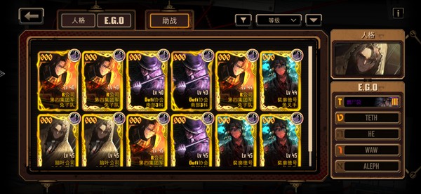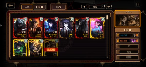 4、人格等级最高50级(人格等级上限会随着游戏进度和版本改变),可通过上场人格进行战斗或消耗人格训练券Ⅲ。png人格训练券获得经验进行等级提升,人格同步等级最高IV阶(目前),可通过消耗纺锤进行提升,而从III阶提升至IV阶时需要额外消耗对应罪人的自我碎片。