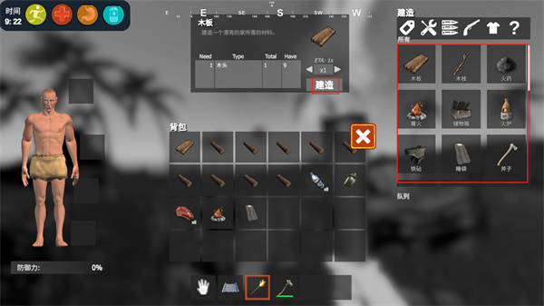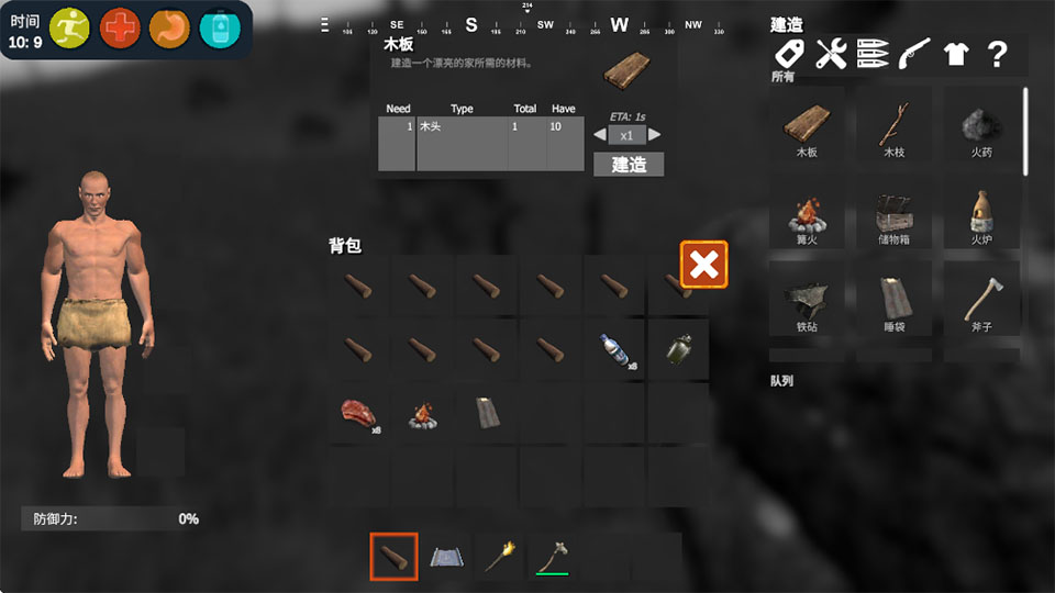7、还需要时刻关注体力、血量、饱食度和水分,当饱食度和水分到底会减少血量,没有血量游戏就结束了;