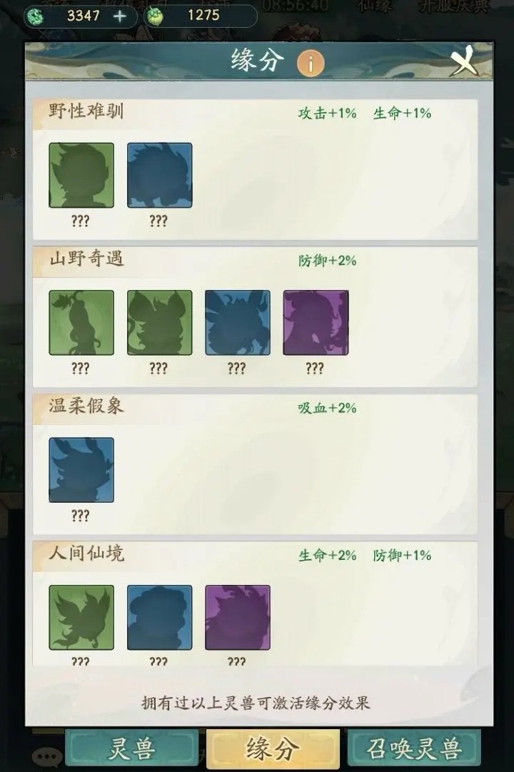 3,【宠物页】包含:【灵兽】、【缘分】、【召唤灵兽】三个菜单。