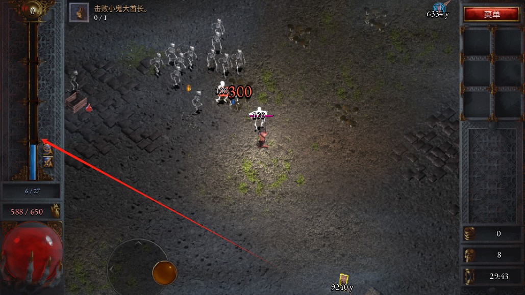 4、当角色属性强化得差不多时,就可以进入关卡挑战,开始对抗骷髅怪等初级敌人。