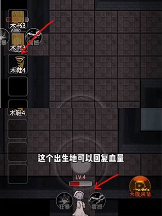 4、作为猎梦者,我们主要通过挠门和捡装备升级,猎梦者自带狂暴和震撼两个技能(要等这两个技能变红)。我们可以通过捡装备来提升自己的攻击力、攻速、防御力(要注意每次只能选择其中的一件捡)。方向定位是:左西右东。
