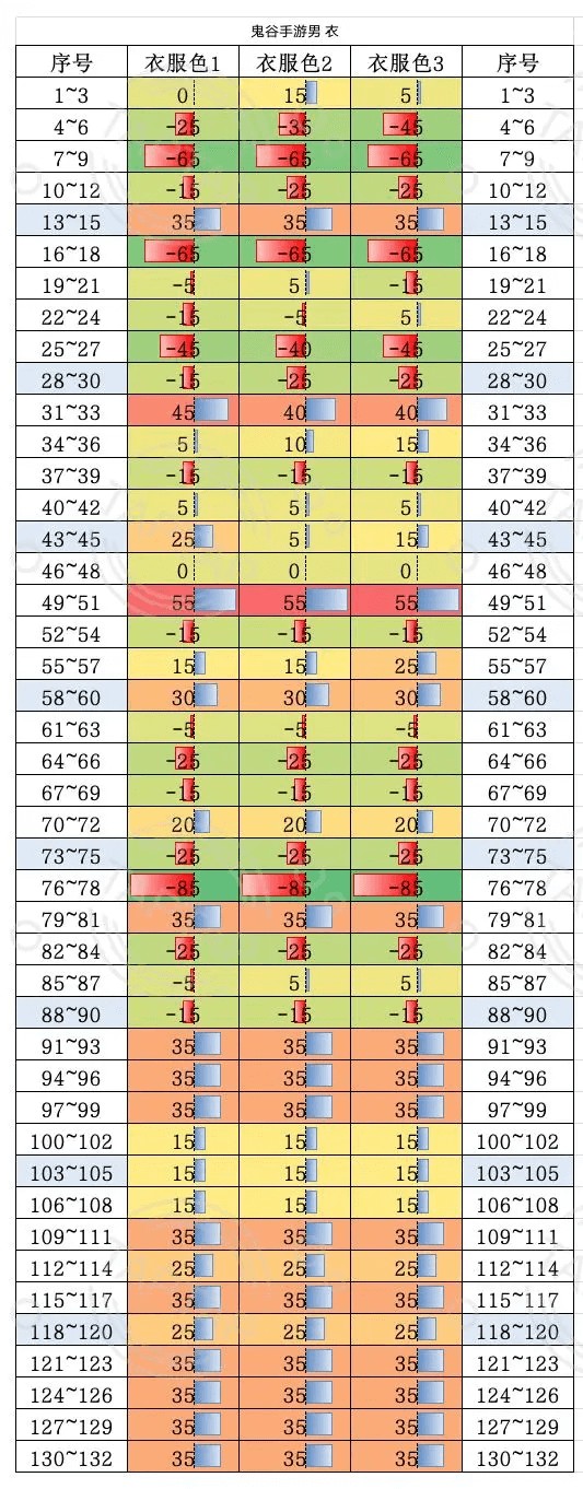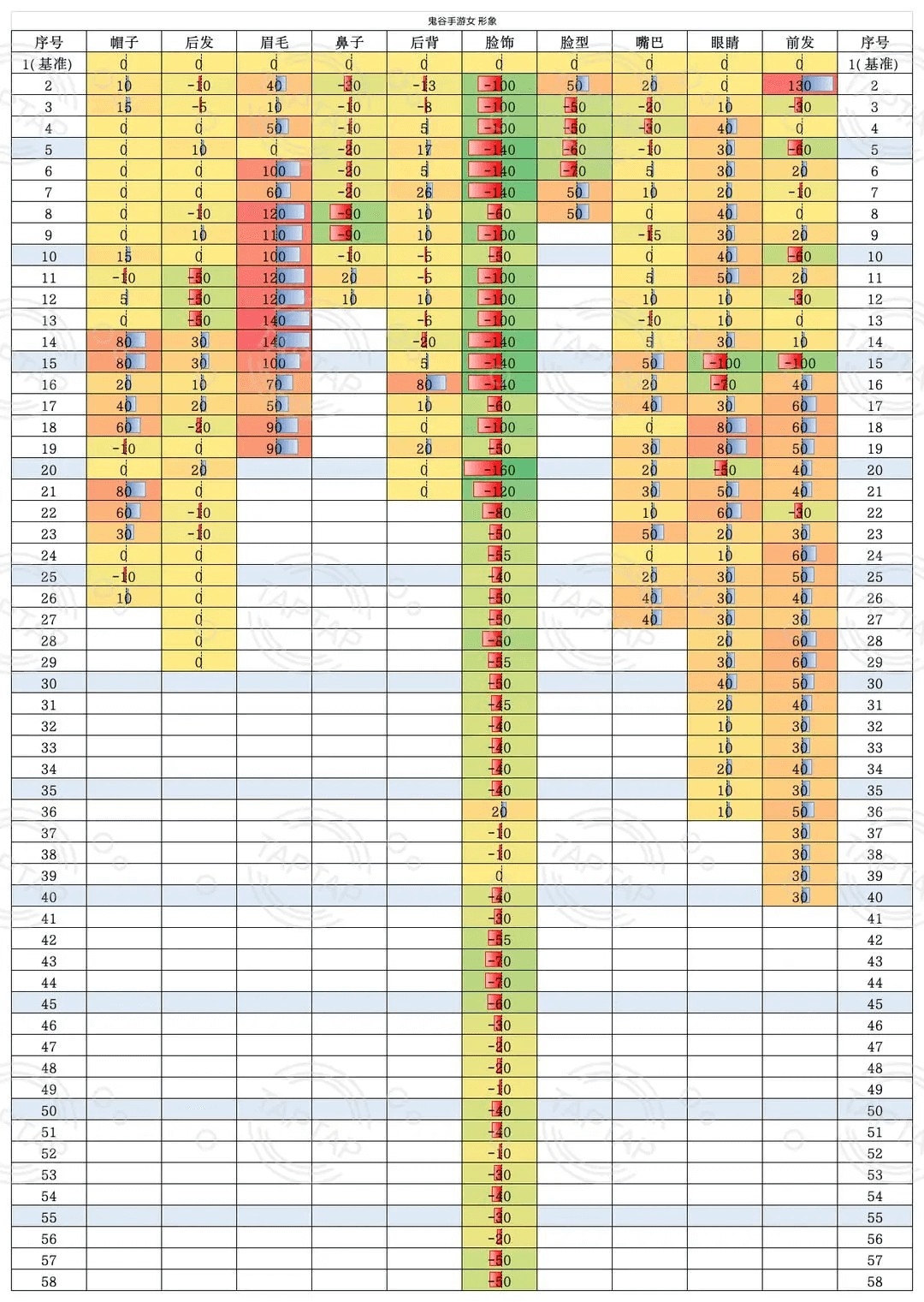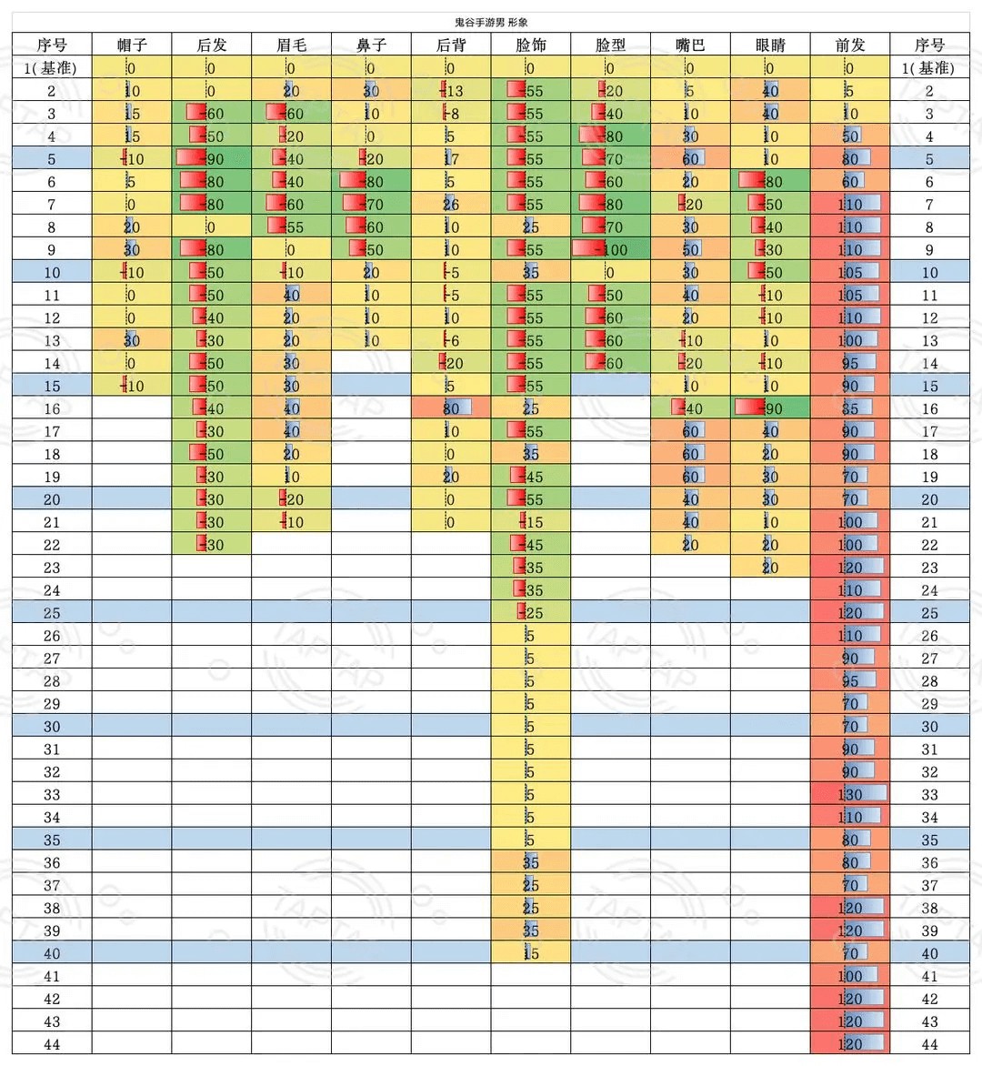 所有数据均以1号位为基准,根据基准进行上下浮动。