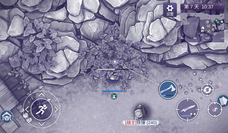 装备和武器在这方面显得尤为明显,刚开始的时候双手空空,纯粹凭走位和闪躲来与各种“小动物们”周旋,只为混个温饱,多余的肉则可以去换点银钱找机会购买点生存用品,慢慢的收集石头和树木制作石斧,伐木挖矿,制作个小棍棒防身,然后收集图纸制作匕首、短刀,慢慢的完成各种任务获取火铳图纸,制作火铳解救村民,可以说游戏的节奏是偏慢的,甚至习惯了各种一刀999快餐手游的小伙伴甚至会觉得游戏偏硬核。
