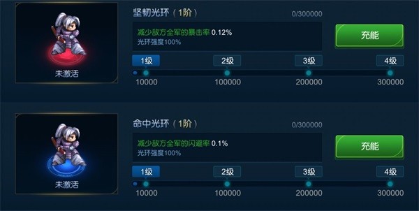 光环的充能能量来自于送礼,无论是送出还是接受礼物都可以获得能量,然后将能量充到你需要的光环里,充到一定程度就可以激活对应等级对应你选的光环,光环的唯一作用是抵消对方的装备效果,分为三种,抵消对方的暴击率加成,抵消对方的闪避率加成,抵消对方的对英雄额外追加伤害,另外,光环有耐久,在你携带光环的情况下,如果你输掉了对局,那么光环的耐久就会掉1%,耐久可以靠金币修复,光环削弱对方的具体效果就是光环本来的效果乘以耐久度,耐久度上限是100%,但没有下限,也就是耐久可以为负数,这时候它就会变成辅助对方的光环,反而增加对方的效果,所以有了光环之后,使用期间注意及时维修。