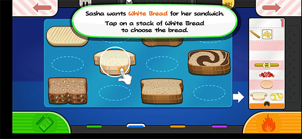 4、在挑选完所需要的食物之后,点击面包片食物就会自动放在面包上,最后只要点击右下方即可制作三明治。