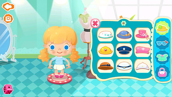 2、看,糖糖正准备出门呢,先给她来个时尚大变身。点击左边的“衣服”气泡,即可为她换上精美的套装。哇,美美哒!