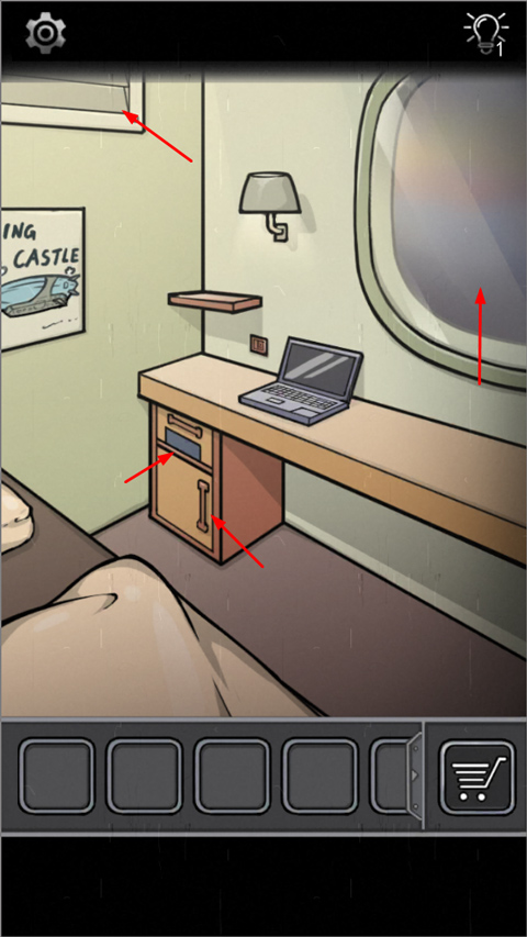 抽屉上有英文字母密码,上面标有1579,点窗户,看到机翼上的英文FLYING CASTELE,得到FNCS,打开抽屉,得螺丝刀,用螺丝刀打开通风口。