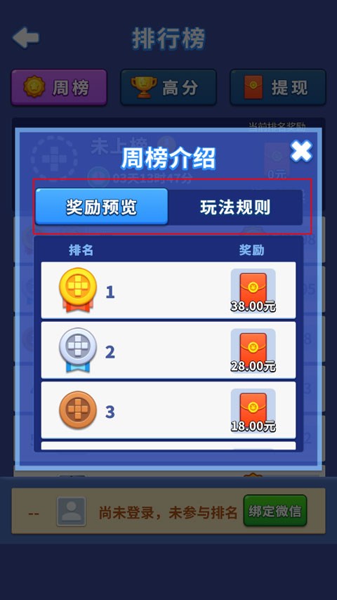 ①依据玩家本周单局最高分进行排名,每周日24:00结算;
