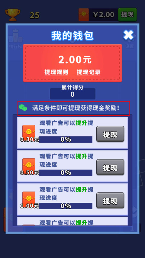 (3)每看一次视频广告,提现进度条会随之增长,当进度条达到100%且用户关卡数满足要求,即可发起提现。