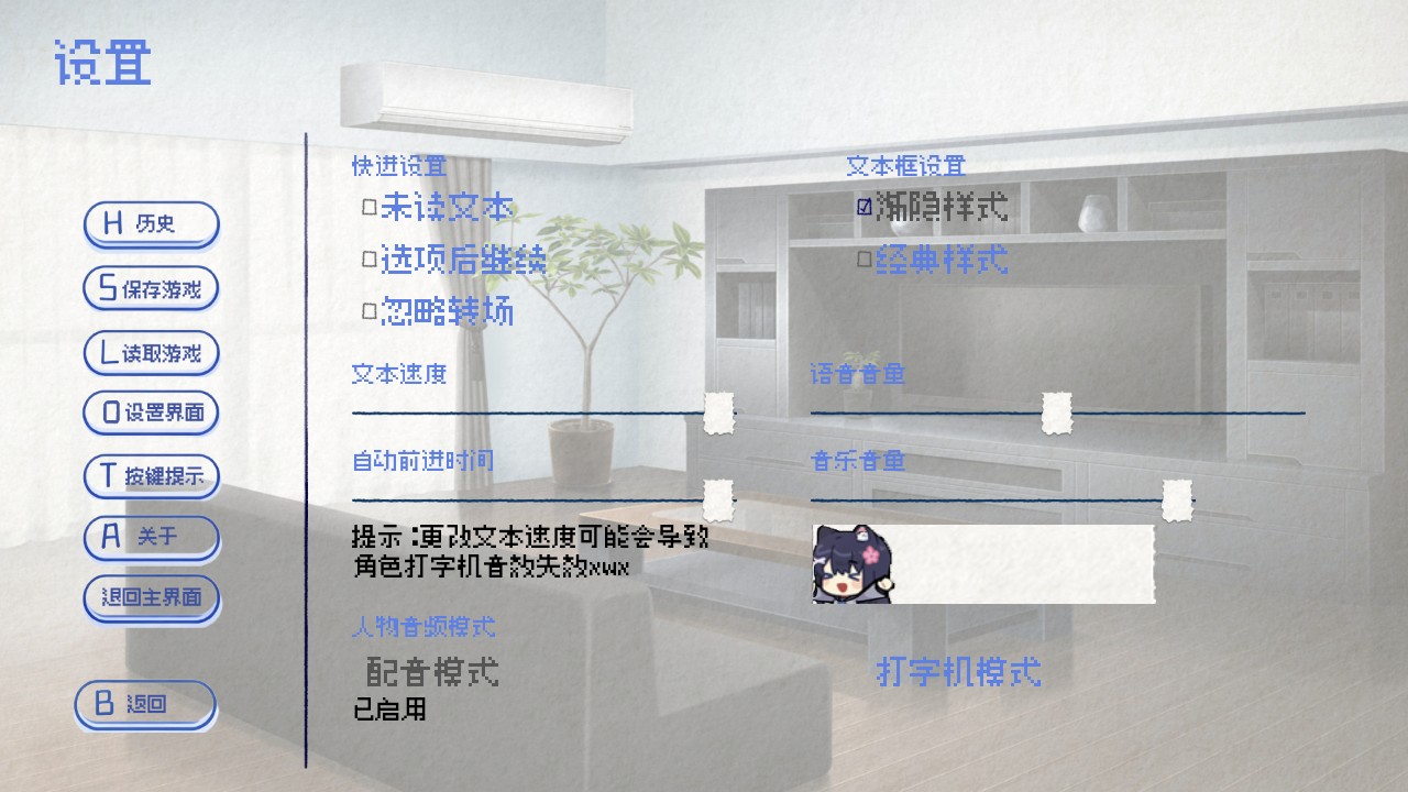 4、另外在游戏设置中你也可以随意调整快进、文本速度、自动前进时间等等