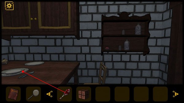 7、进入厨房,从桌子上获得勺子,然后进入带血的房间中