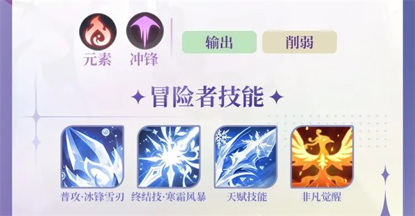4、天赋技能:战斗开始可获得元素护佑,叠加伤害减免;释放终结技后能进行寒霜收割,造成真实伤害,降低敌方能量与异常状态抗性。