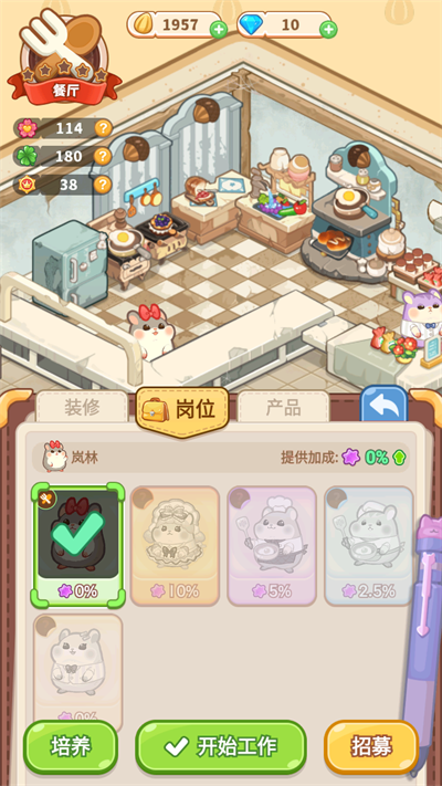 1、进入店铺点击右下方“岗位“按钮开始给店铺安排收银员以及研究员(厨师);