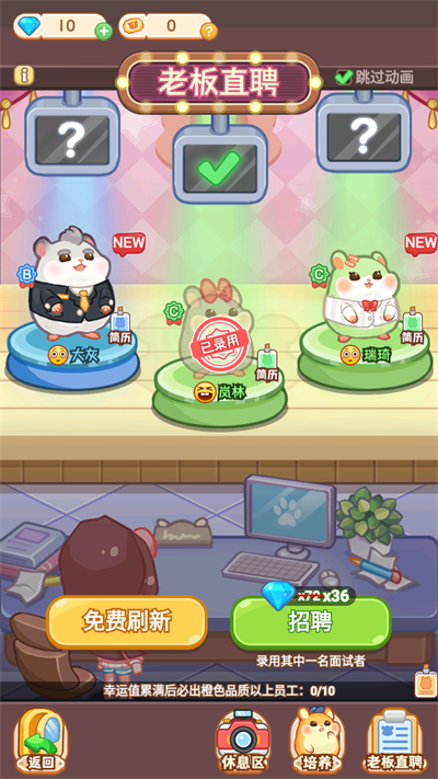 2、在前期人手不足的情况,我们需要适当通过”老板直聘”来招一些鼠鼠充当我们的员工,当然了,前期的话能经营的店铺比较少,人力缺位不大,我们只需要使用免费的招募次数来招募员工就好了;