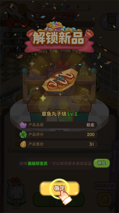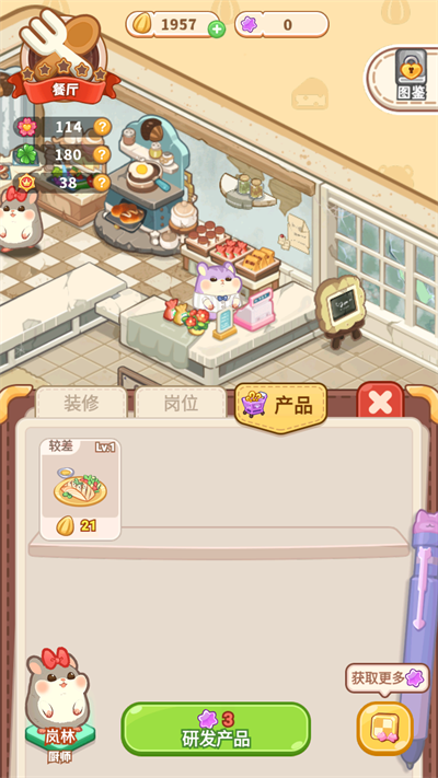 4、如果想要吸引更多客人的话,就要开始研发新产品,进入店铺,点击右下角的“产品”按钮,可以看到店铺目前拥有的产品。点击下方的“研发产品”就可以进行研发啦;