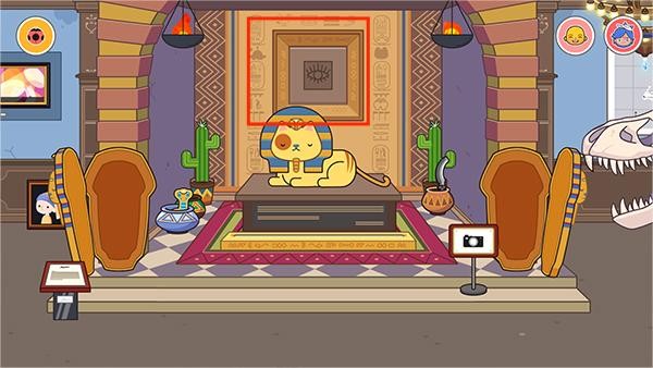 点击狮身人面像上方的“旺旺仙贝”形状图案,即可开启中间的密室,里面藏有埃及法老王套装。