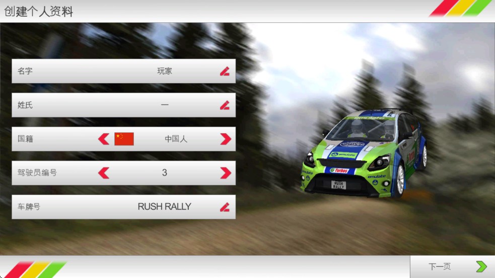 1、打开拉力竞速3游戏,创建人物,创建好之后,点击下一页;