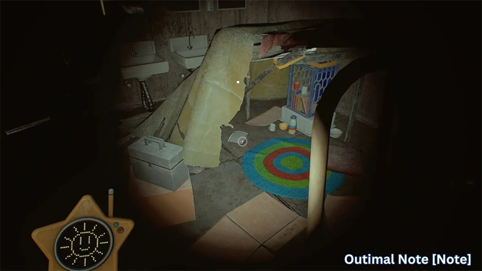 你会发现自己回到了最初穿过第一个窗口的区域。地上的箭头指向走廊尽头的门,所以我们应该去那里,但我们先会停几个地方。先打开手电筒去右边的洗手间吓跑敌人。爬到帐篷下面,你会发现一份“笔记”。