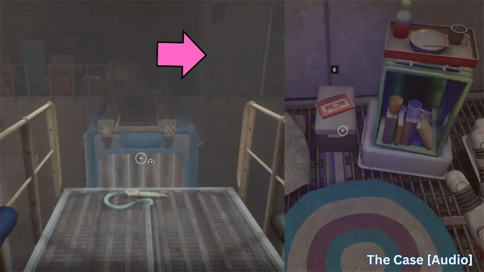 推车会停在中间的走道。虽然这不是路线,但你仍然应该跳过去去收集《案件》音频磁带。就在这条走道的右角。