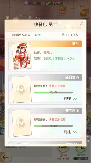 3、员工委派:解锁伙伴后,第一时间委派至快餐店,利用+60%收入加成快速提升营收;后续按店铺等级解锁新品推销、餐品制作等岗位,逐步完善员工体系。