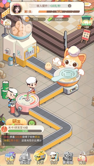 2、店铺升级与研发同步进行,用经营收益投入店铺升级,解锁更多餐品与员工岗位,形成“升级→解锁→收益提升→再升级”的良性循环。