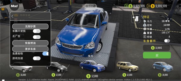 1、在开始游戏之前可以先进入商店购买自己喜欢的车辆车辆,由于拥有无限金币设定,玩家可自由消费,同时还可通过辅助菜单直接实现免费购车,轻松解锁心仪车型。