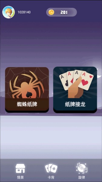 1、首次进入游戏,你会在主界面看到“蜘蛛纸牌”和“纸牌接龙”这两种核心玩法;