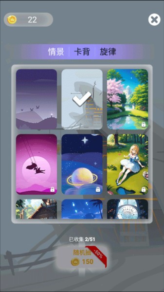 7、此外,玩家还可以在“卡背”界面,使用赢得的金币来解锁和收集更多好看的场景、背景以及动听的旋律哦~