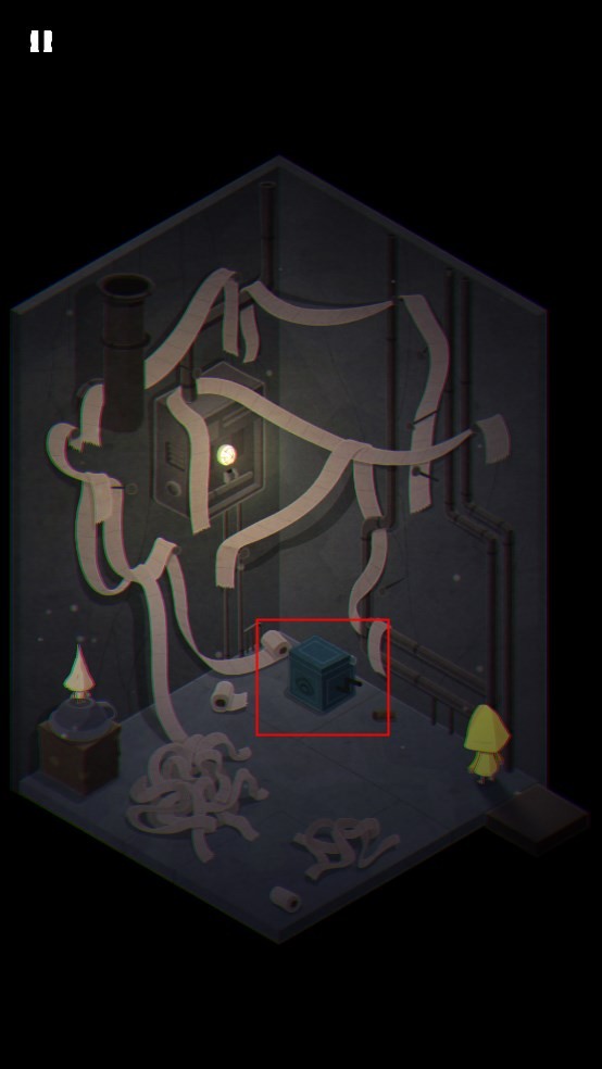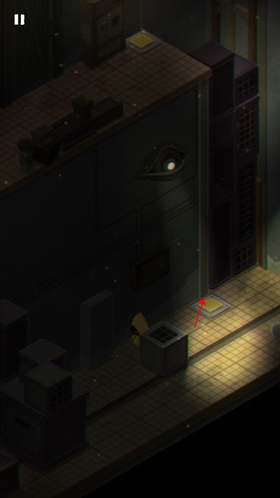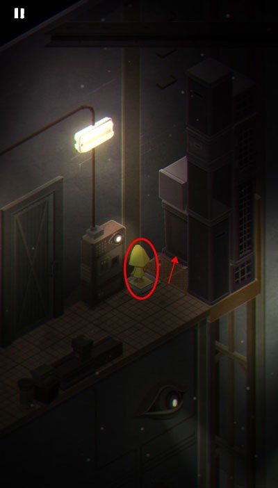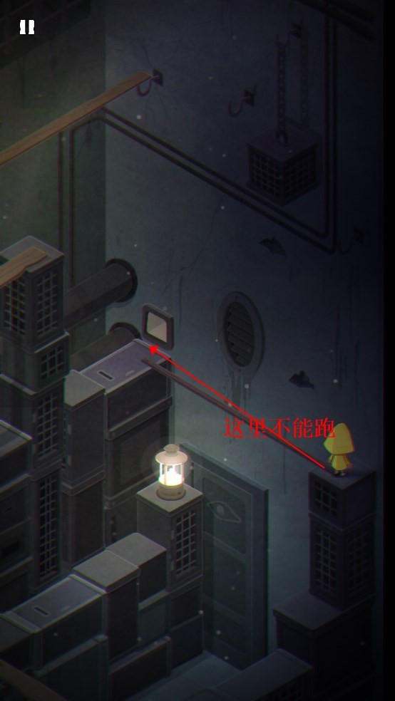 5、来到落下的箱子处,记得不要被灯光扫到,按下按钮将送工具的道具放下来