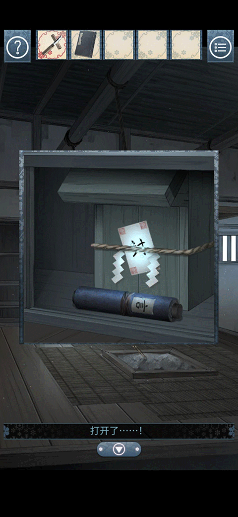 打开柜子以后用刀划开,得到符咒和场地,根据书里的内容反向操作,正常按照符咒首字来读,应该是来春去冬,反过来就是冬去春来,把冬去春来输入到场地里,减轻门上的力量,然后根据从大的符咒开始按反过来,就是从小的符咒开始点,从小到大点完以后门开,剧情。