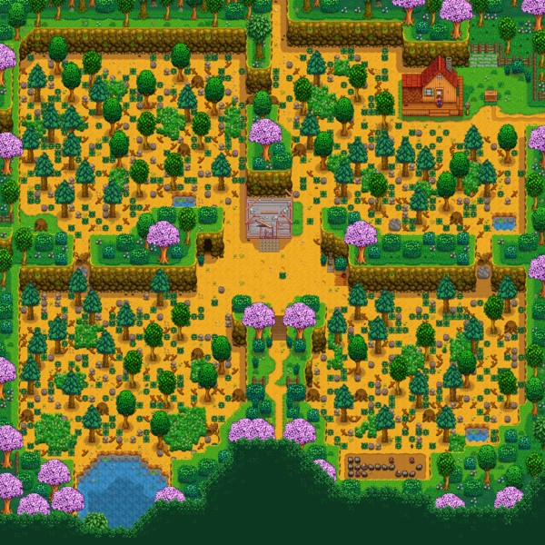 地图地块面积很大,且除正下方与右边的两个池塘以外大部分都是可耕地,是种植农作物和饲养动物的理想选择。