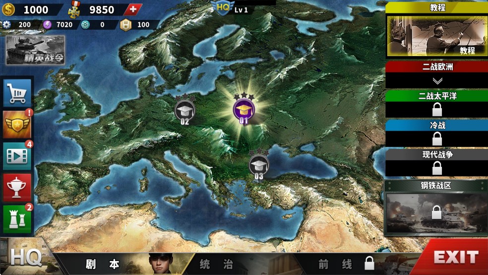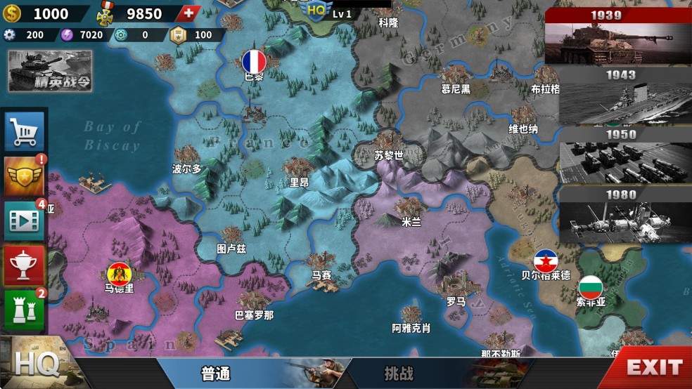 3、天朝:前期看似只有一个战场,实际上需要为三线作战做准备。开局给北京上经济地标,南京上工业地标。然后陈绍宽,榴弹炮,火箭炮调下来收复宝岛台湾。把韩国打掉之后稍微等一下,等日本把兵调下水之后用海军消灭他们。与此同时,中部的军队,尤其是重庆的重坦克要调下来把嘤髪打掉。爆两队满编重坦克,分别上古德里安和空将,调去欧洲伺机占领两个城。 中期先把日本打掉,这时苏联大概已经占领了北欧,古德里安和空将到达了欧洲。依靠空军帮助,古德里安可以不断连击收割欧洲的杂牌军(精锐应该被苏联消耗光了)。南部的军队继续进发征服澳大利亚。与此同时,组建舰队护送陆军渡海登陆加拿大和美国。