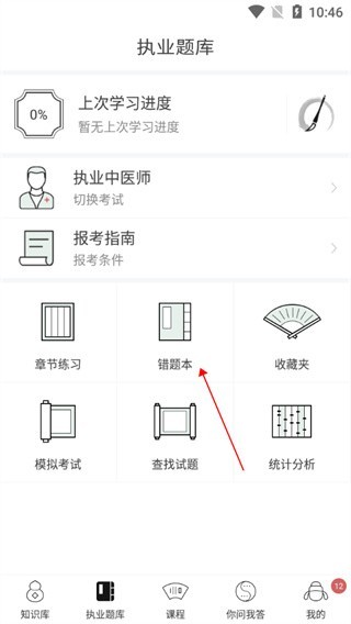 1、打开中医通免费版,在软件的“执业题库”的功能界面下可以看到“错题本”的功能选项,点击进入即可;